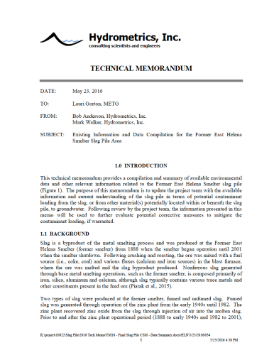 Technical Memorandum: Existing Information and Data Compilation for the former East Helena Smelter Slag Pile Area, May 23, 2016.